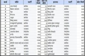 ब्यावरा/राजगढ़:–नगरीय निकाय चुनाव परिणाम में भाजपा ने 18 वार्डो में से 10 वार्डो में अपनी जीत दर्ज की, वहीं कांग्रेस ने 7 वार्डो में अपना कब्जा जमाया,वहीं एक अन्य निर्दलीय प्रत्याशी ने अपनी जीत दर्ज की है, जीते हुए प्रत्याशी इस प्रकार है ,वार्ड 1 उमा पूनम मेवाडे कांग्रेस 51,वार्ड 2 विक्रम जगताप भाजपा 97 ,वार्ड 3 नेहासनी विजयवर्गी कांग्रेस 47, वार्ड 4 गिरिराज शाक्यवार कांग्रेस 170, वार्ड 5 अतुल जगताप कांग्रेस 22,वार्ड 6 विष्णु साहू भाजपा 351,वार्ड 7 राजकुमारी कैलाश कुशवाहा कांग्रेस 9,वार्ड 8 सुमन राठौर भाजपा 50,वार्ड 9 तारा गोपाल जाटव भाजपा 288,वार्ड 10 अफ़रोज़ इक़बाल हुसैन निर्दलीय 135,वार्ड 11 रूचि रवि बड़ोंने भाजपा 15,वार्ड 12 ज्ञानू विजयवर्गीय कांग्रेस 62,वार्ड 13 हेमलता शर्मा भाजपा 209,वार्ड 14 राजलबाई रामबाबू प्रजापति भाजपा 206,वार्ड 15 ज्योति मिस्त्री कांग्रेस 142, वार्ड 16 जया मकलेश चौहान भाजपा 500, वार्ड 17 मनीषा रमेश साहू भाजपा 324,वार्ड 18 लीला देवी फूलसिंह कुशवाहा भाजपा 148, वोटो से विजय प्रत्याशी घोषित हुए हैं,जिनको एसडीएम संजय उपाध्याय द्वारा प्रमाण पत्र प्रदान किए गए, जीते हुए सभी प्रत्याशियों ने अपने अपने वार्डो में ढोल धमाके के साथ जीत की ख़ुशी मनाई, जीते हुए प्रत्याशियों का वार्ड वासियों ने फूल मालाओं से भव्य स्वागत किया,